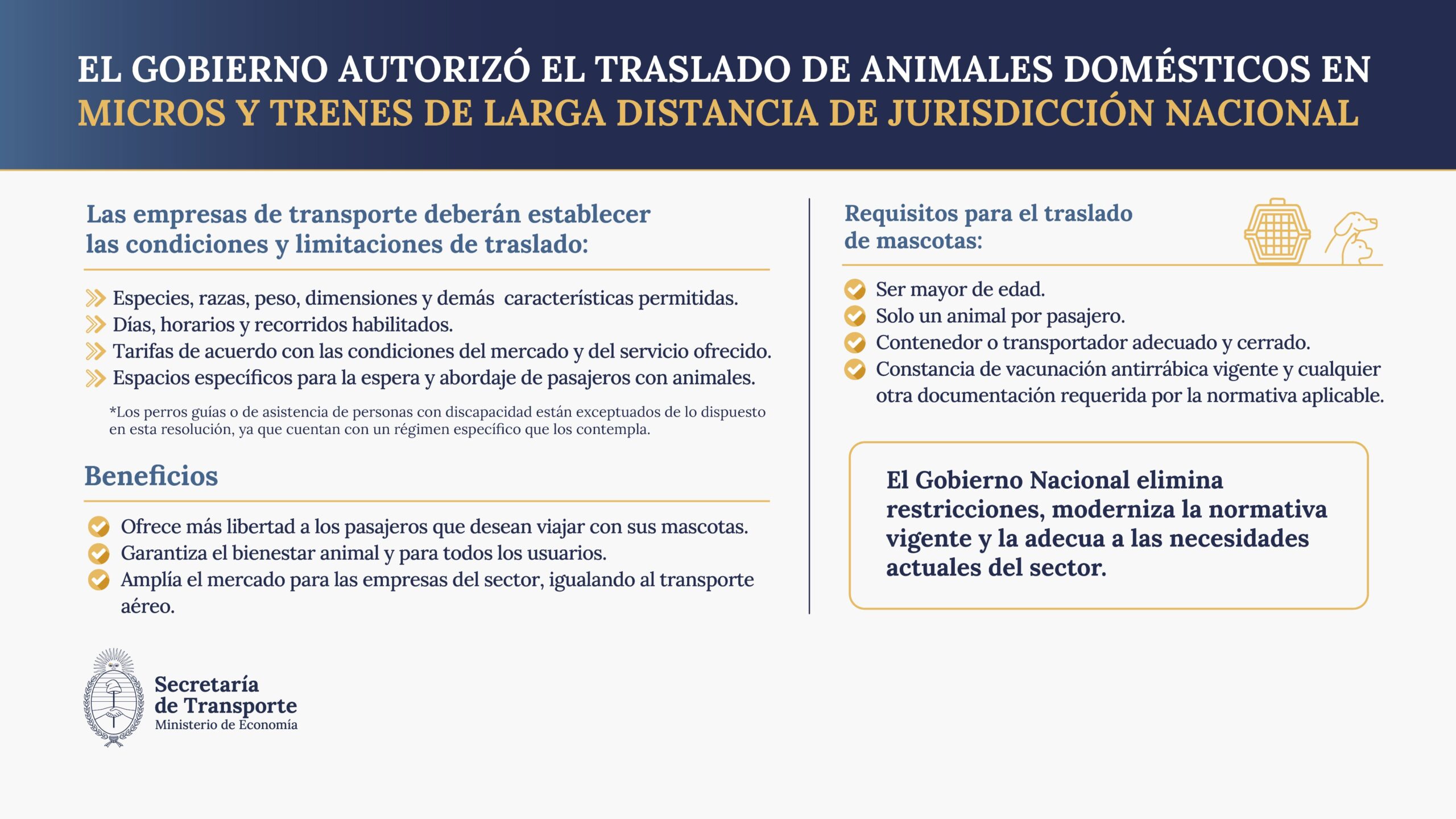 El Gobierno aclaró que los perros guías o de asistencia para personas con discapacidad quedan exceptuados de estas nuevas disposiciones, ya que continúan bajo su régimen específico vigente.