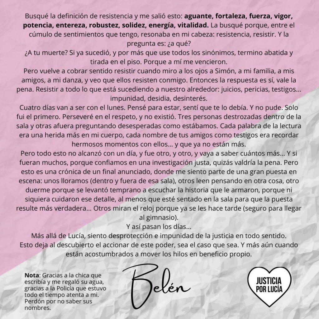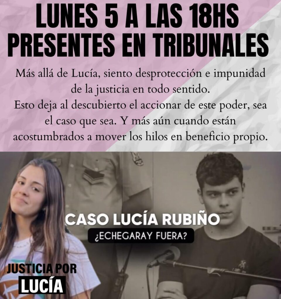 La convocatoria de este lunes se enmarca en un fuerte cuestionamiento al accionar del Poder Judicial. “Más allá de Lucía, siento desprotección e impunidad de la justicia en todo sentido. Esto deja al descubierto el accionar de este poder, sea el caso que sea. Y más aún cuando están acostumbrados a mover los hilos en beneficio propio”, reza el comunicado que circula en redes. Es una de las frases de la mamá de Lucía, Belén Montilla, quien hizo pública una carta el viernes 2 de mayo pasado.