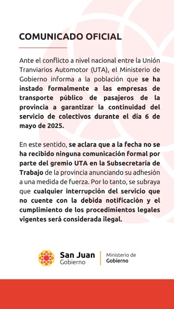 El mismo ministerio aclaró que hasta última hora la Subsecretaría de Trabajo no había recibido ninguna notificación por parte de la UTA San Juan , que anunciara su adhesión a la medida de fuerza. En consecuencia, la autoridad dispuso que cualquier interrupción del transporte público de pasajeros será considerada ilegal. Esto implica una sanción para las empresas, por incumplimiento del compromiso asumido en el pliego de licitación, y también sanción para el sindicato.