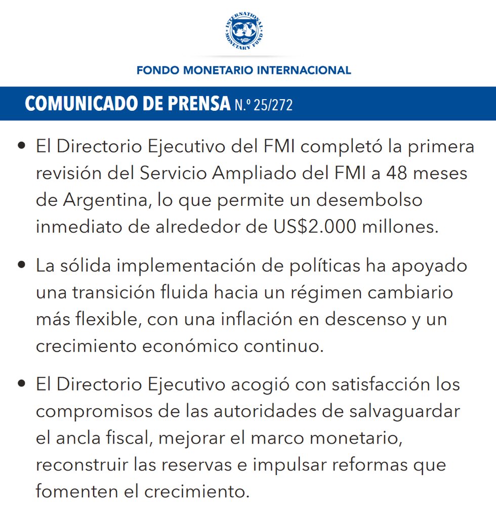 El documento del FMI destaca: «La sólida implementación de políticas apoyó una transición fluida hacia un régimen cambiario más flexible. La inflación desciende y el crecimiento económico continúa». También subraya que «el Directorio Ejecutivo acogió con satisfacción los compromisos de las autoridades. Argentina salvaguarda el ancla fiscal, mejora el marco monetario, reconstruye las reservas e impulsa reformas que fomentan el crecimiento».