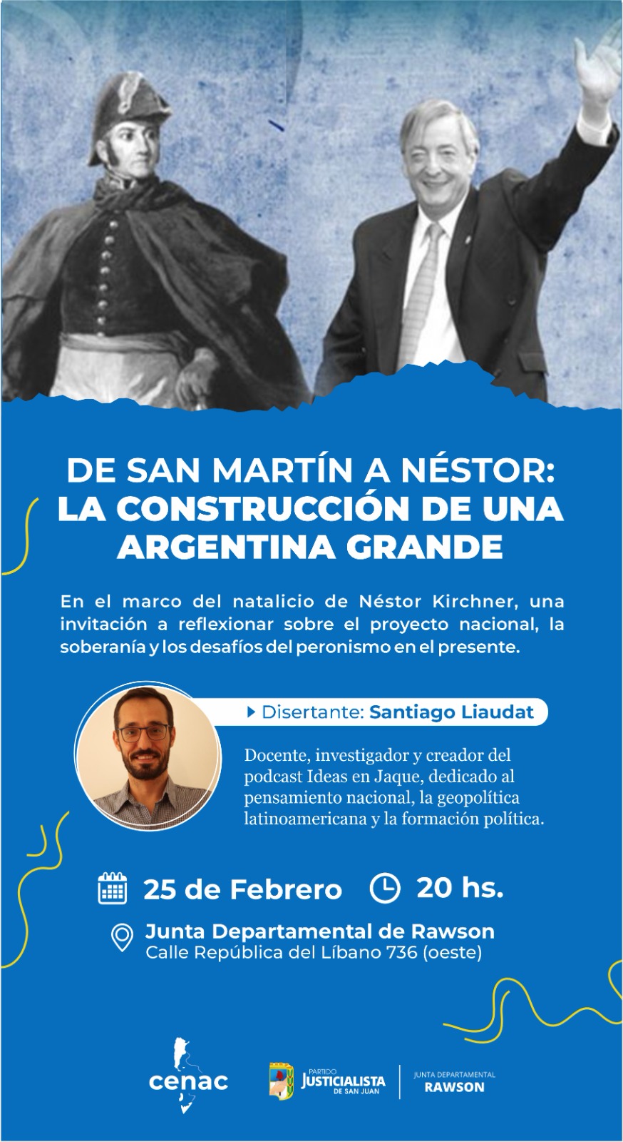 Liaudat participó de una charla en la Junta Departamental del PJ de Rawson, donde vinculó los legados de San Martín y Néstor Kirchner bajo el concepto de soberanía.
