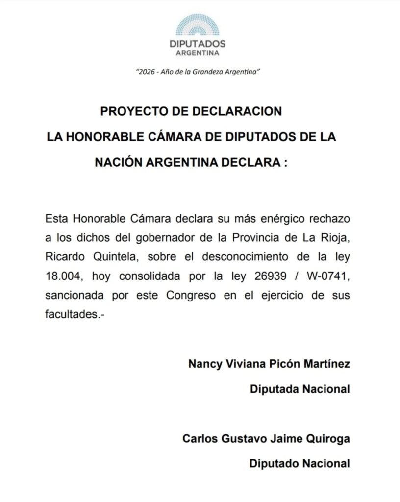 Los diputados nacionales por San Juan, Nancy Picón y Carlos Jaime, presentaron un proyecto de declaración ante la Cámara de Diputados de la Nación para expresar su más enérgico rechazo a las pretensiones territoriales del gobernador de La Rioja, Ricardo Quintela. La iniciativa busca blindar la soberanía de San Juan sobre áreas estratégicas como el Proyecto Vicuña e Ischigualasto, reafirmando la vigencia de las leyes nacionales que definen los límites interprovinciales.