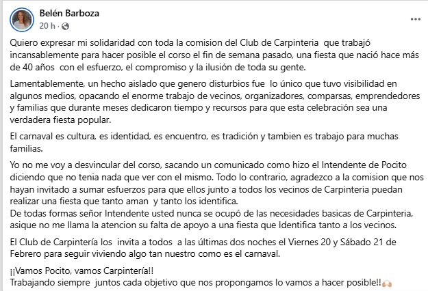 La secretaria de Turismo provincial, Belén Barboza, cuestionó la postura del municipio de desligarse de los hechos ocurridos dentro de su territorio. La funcionaria defendió la realización del carnaval y ratificó el apoyo de su área a las expresiones culturales de la localidad de Carpintería. El incidente provocó un debate público sobre la falta de coordinación entre las autoridades departamentales y provinciales para garantizar el orden en un espectáculo que reunió a más de 17.000 personas.