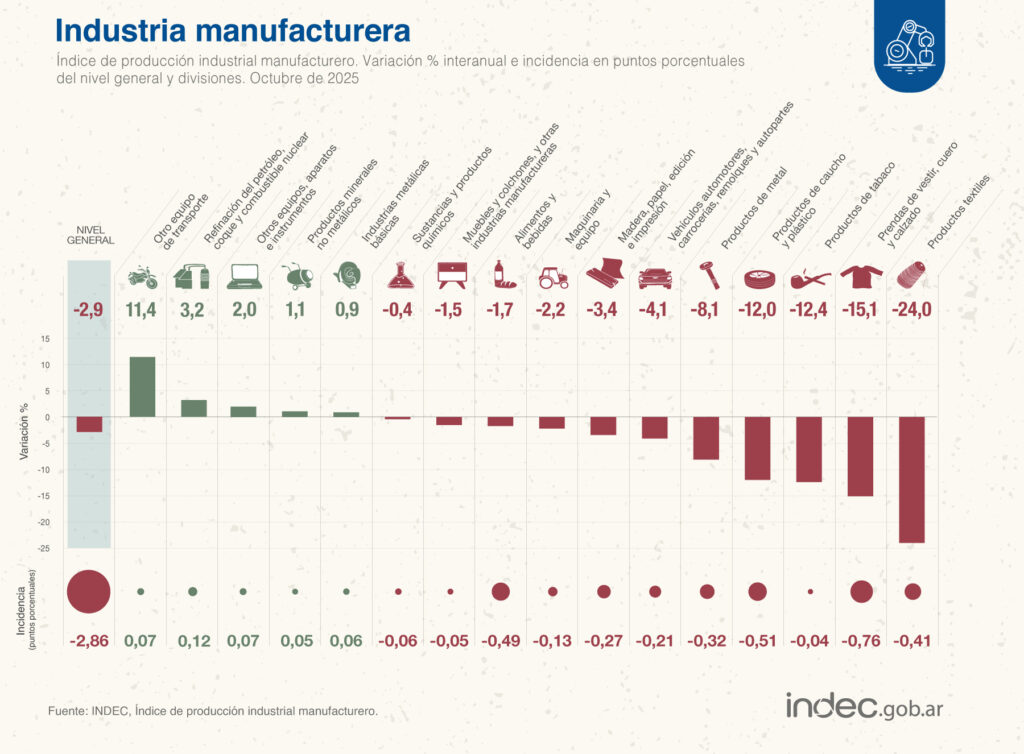 La producción industrial de Argentina encadenó su cuarto retroceso consecutivo en términos interanuales al caer un 2,9% en octubre de 2025, según informó el Instituto Nacional de Estadística y Censos (INDEC). Esta caída, que ubicó al sector en su nivel más bajo desde el mes de marzo, estuvo fuertemente influenciada por la incertidumbre respecto al resultado electoral y el impacto de la apertura comercial en la demanda local.