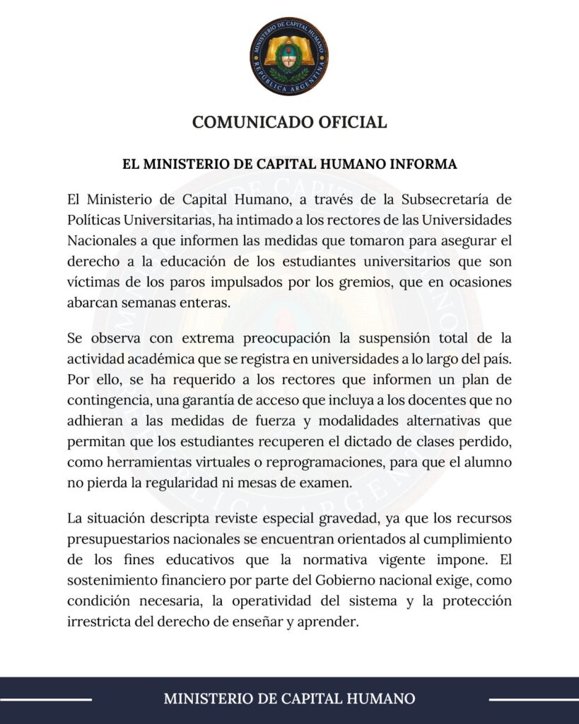 El Ministerio de Capital Humano, a través de la Subsecretaría de Políticas Universitarias, intimó formalmente a los rectores de las universidades nacionales para que informen las medidas adoptadas para garantizar el dictado de clases ante el paro docente que afecta a las casas de altos estudios. El Gobierno nacional manifestó una «extrema preocupación» por la suspensión de la actividad académica y exigió la presentación de un plan de contingencia que asegure el derecho a la educación de los estudiantes.