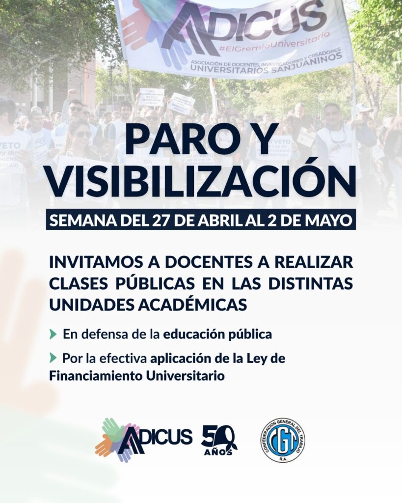 Desde el sector universitario, la respuesta no se hizo esperar. Los sindicatos docentes y no docentes de la Universidad Nacional de San Juan ratificaron la medida de fuerza y renovaron la convocatoria a un «abrazo simbólico» a la Escuela Industrial Domingo Faustino Sarmiento para este miércoles 29 de abril a las 9 de la mañana, en una acción conjunta entre la Federación Universitaria de San Juan, ADICUS, SIDUNSJ, UDA y APUNSJ.