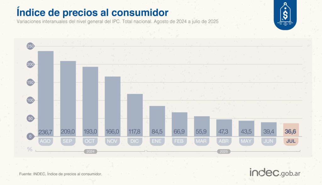 El Instituto Nacional de Estadística y Censos (INDEC) informó que la inflación de julio de 2025 fue del 1,9%. Este dato representa una leve aceleración en comparación con el 1,6% de junio, pero mantiene la variación mensual por debajo del 2% por tercer mes consecutivo.