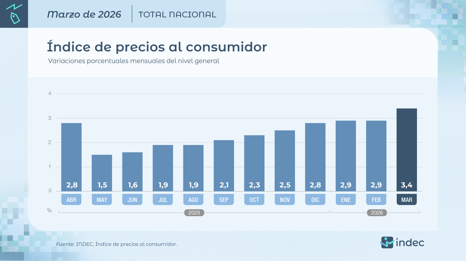 | Nivel General (Total Nacional) | 3,4% |