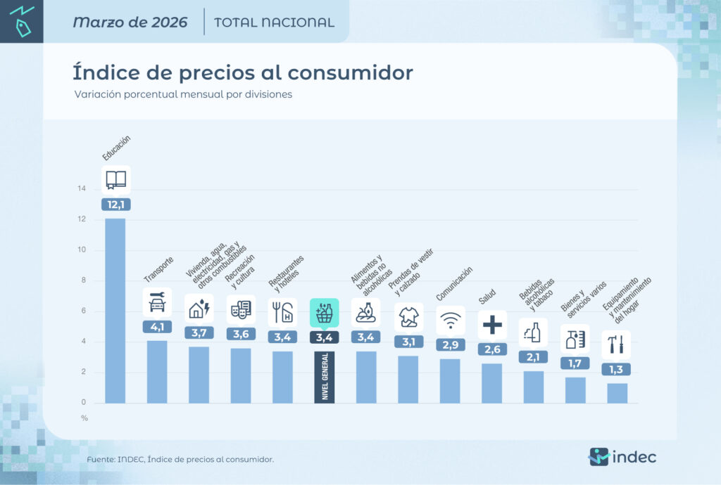 El informe técnico del INDEC detalló que la división con mayor alza fue Educación, con un 12,1%, debido al inicio del ciclo lectivo. Le siguió Transporte (4,1%), impulsado por los combustibles y el transporte público, y Vivienda, agua, electricidad y gas (3,7%). El presidente justificó el dato basándose en la «estacionalidad» de marzo y en factores externos, señalando además que si se quitara el efecto de la carne, la inflación núcleo estaría en línea con el mes anterior.