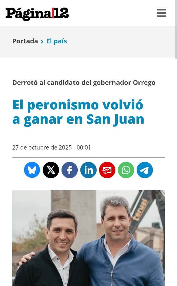 Página 12, con fuentes relativas al Instituto Patria, le dio el reconocimiento al senador Uñac por el resultado obtenido por el peronismo en San Juan.