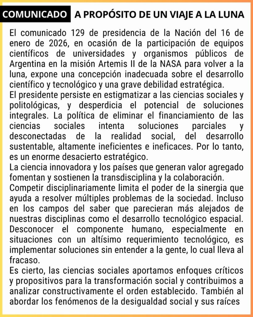 Las instituciones académicas denunciaron que el Gobierno Nacional expuso una concepción errónea sobre el desarrollo científico al estigmatizar a las disciplinas sociales en el marco del anuncio de la participación argentina en la misión Artemis II de la NASA.