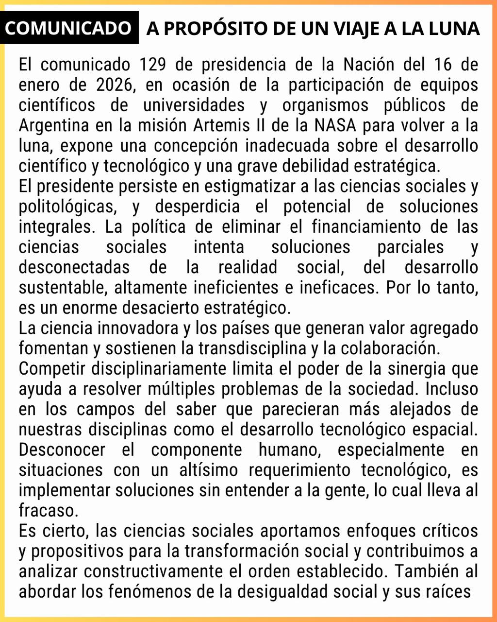 Las Facultades de Ciencias Sociales de las universidades públicas del país emitieron un fuerte comunicado a raíz de una declaración presidencial referida a la participación argentina en el lanzamiento de la misión Artemis II de la NASA. La Universidad Nacional de San Juan (UNSJ) hizo propio el descargo académico y lo compartió en sus redes sociales oficiales.