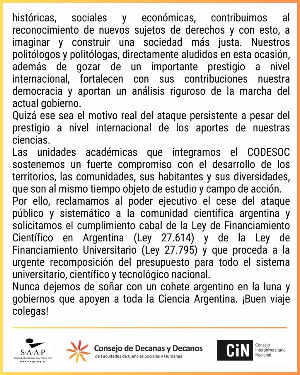 El Consejo de Decanas y Decanos de Facultades de Ciencias Sociales y Humanas (CODESOC), junto a la Sociedad Argentina de Análisis Político (SAAP) y el Consejo Interuniversitario Nacional (CIN), rechazaron el comunicado 129 de la Oficina del Presidente emitido el pasado 16 de enero de 2026.