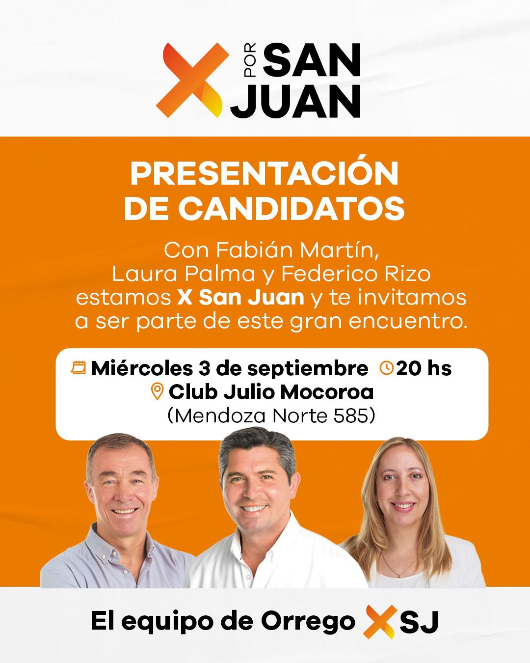 Orrego destacó que el equipo que conformó con Fabián Martín, Laura Palma y Federico Rizo tendrá la misión de «defender a San Juan y a su gente» con una «identidad propia, profundamente nuestra». Expresamente, el gobernador solicitó a sus candidatos que mantuvieran «la camiseta de San Juan puesta» y trabajaran con fuerza por la provincia.