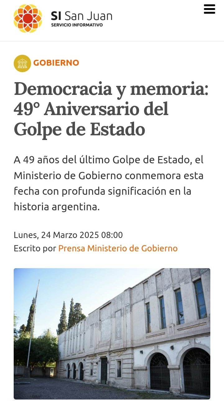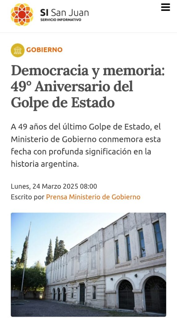 En contraste, el Ministerio de Gobierno de San Juan compartió un comunicado de prensa titulado ‘Democracia y memoria: 49 Aniversario del Golpe de Estado’. El documento fue elaborado con una fuerte carga, tanto en su contenido como en la forma de presentarlo.