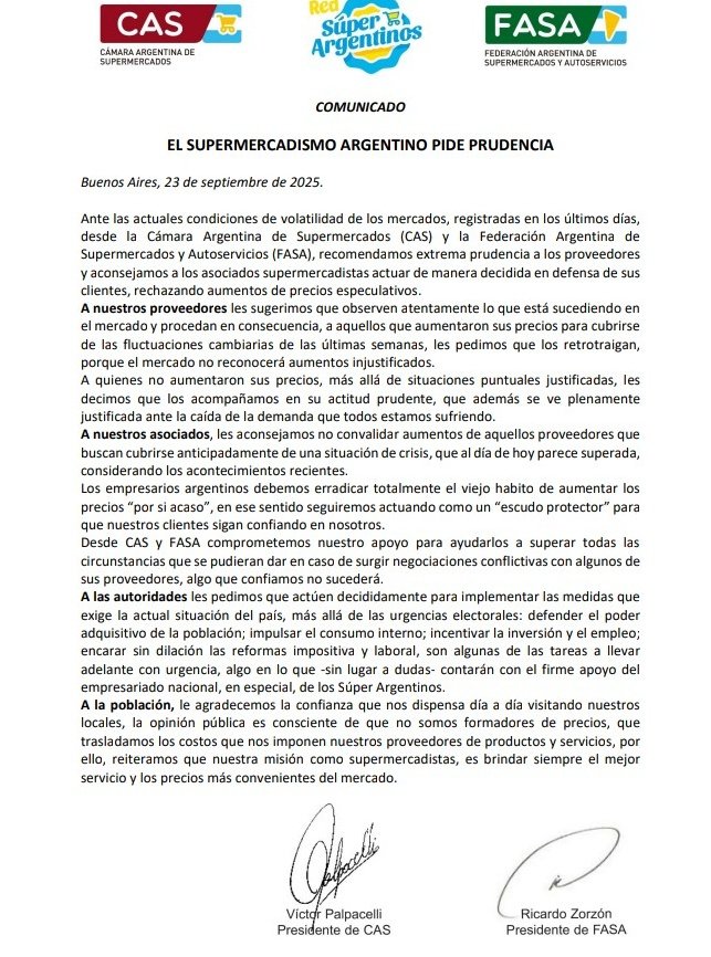 «Recomendamos extrema prudencia a los proveedores y aconsejamos a los asociados supermercadistas actuar de manera decidida en defensa de sus clientes, rechazando aumentos de precios especulativos“, señalaron la CAS y la FASA.