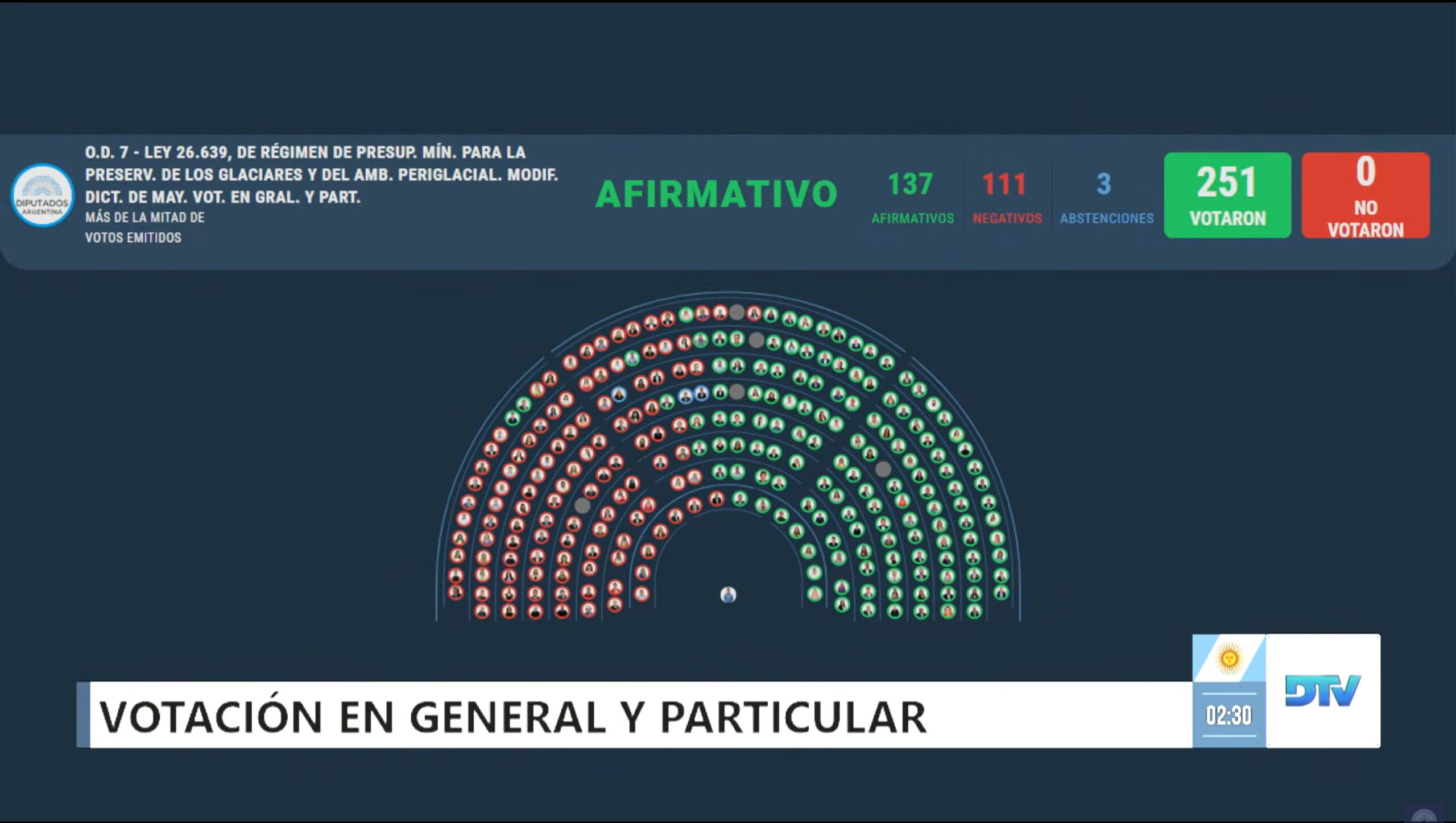 En una jornada decisiva para la política minera y ambiental, la Cámara de Diputados de la Nación le dio sanción completa a la modificación de la Ley 26.639 de Presupuestos Mínimos para la Preservación de los Glaciares y del Ambiente Periglacial. El proyecto, que ya contaba con media sanción del Senado desde fines de febrero, fue aprobado con 137 votos a favor, 111 en contra y 3 abstenciones.