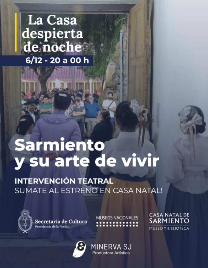 El Museo Casa Natal de Sarmiento será el escenario este sábado 6 de diciembre, a partir de las 20:00 horas, de la intervención teatral «Sarmiento y su arte de vivir», una producción local de teatro independiente que busca rescatar la visión del prócer sobre la educación y la cultura.