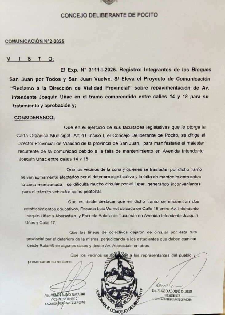 La comunicación fue sancionada tras un acuerdo de los concejales del bloque San Juan por Todos (uñaquismo) y San Juan Vuelve (giojismo). En la sesión del 8 de abril aprobaron esta solicitud dirigida a la Dirección de Vialidad Provincial por la repavimentación de Avenida Joaquín Uñac entre calles 14 y 18.