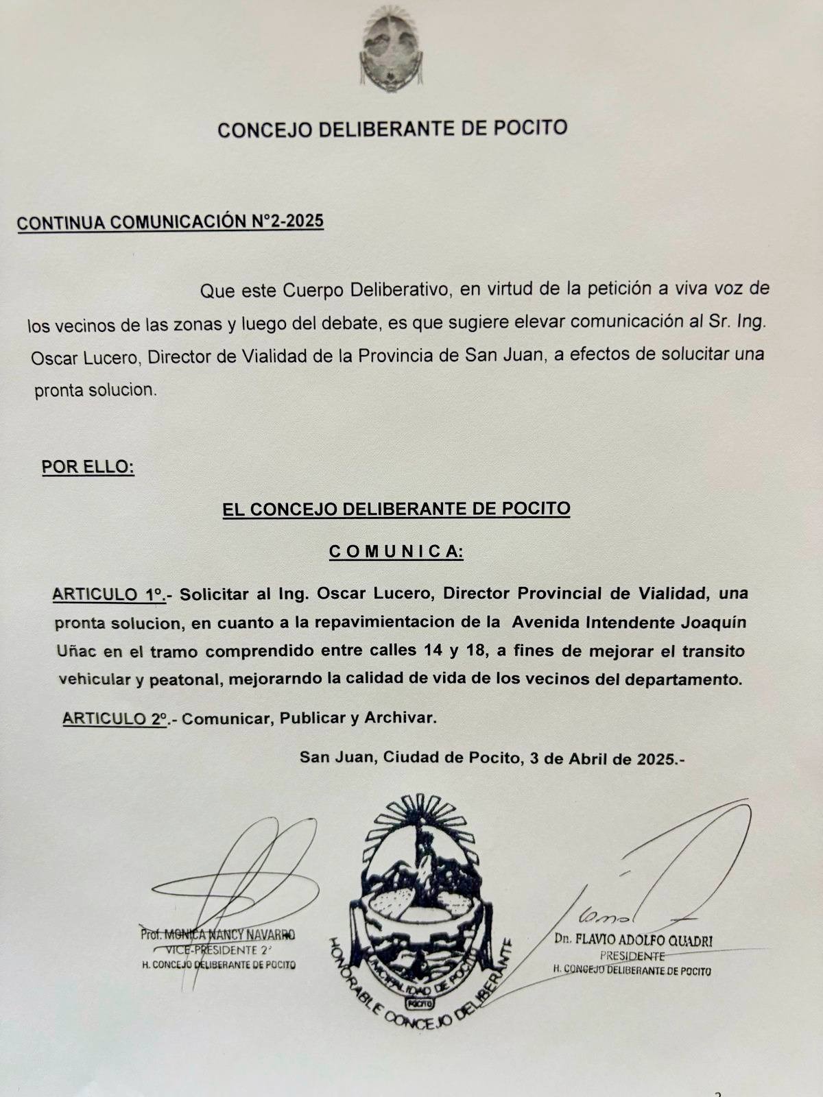 La comunicación fue sancionada tras un acuerdo de los concejales del bloque San Juan por Todos (uñaquismo) y San Juan Vuelve (giojismo). En la sesión del 8 de abril aprobaron esta solicitud dirigida a la Dirección de Vialidad Provincial por la repavimentación de Avenida Joaquín Uñac entre calles 14 y 18.
