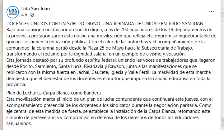 Bajo la consigna «Unidos por un sueldo digno», más de 700 educadores de los 19 departamentos de la provincia -según UDA- protagonizaron una movilización que partió desde la Plaza 25 de Mayo hacia la Subsecretaría de Trabajo este miércoles. La jornada destacó por su espíritu federal, integrando a trabajadores de Pocito, Sarmiento, Santa Lucía, Rivadavia y Rawson, con réplicas en Jáchal, Caucete, Iglesia y Valle Fértil.