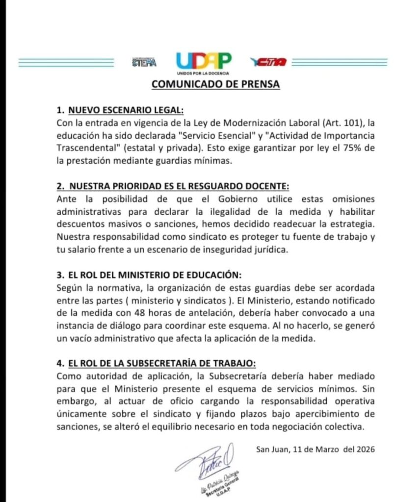 La huelga de 48 horas prevista para el miércoles y jueves resultó frenada por la Subsecretaría de Trabajo de San Juan, que actuó de oficio para evitar la parálisis del servicio educativo. Ante la intimación de la autoridad laboral, que recordó la vigencia de la normativa que declara a la educación como «Servicio Esencial» con el deber de garantizar el 75% de la prestación, los gremios confirmaron la suspensión de la huelga para resguardar el salario de los educadores ante posibles sanciones.
